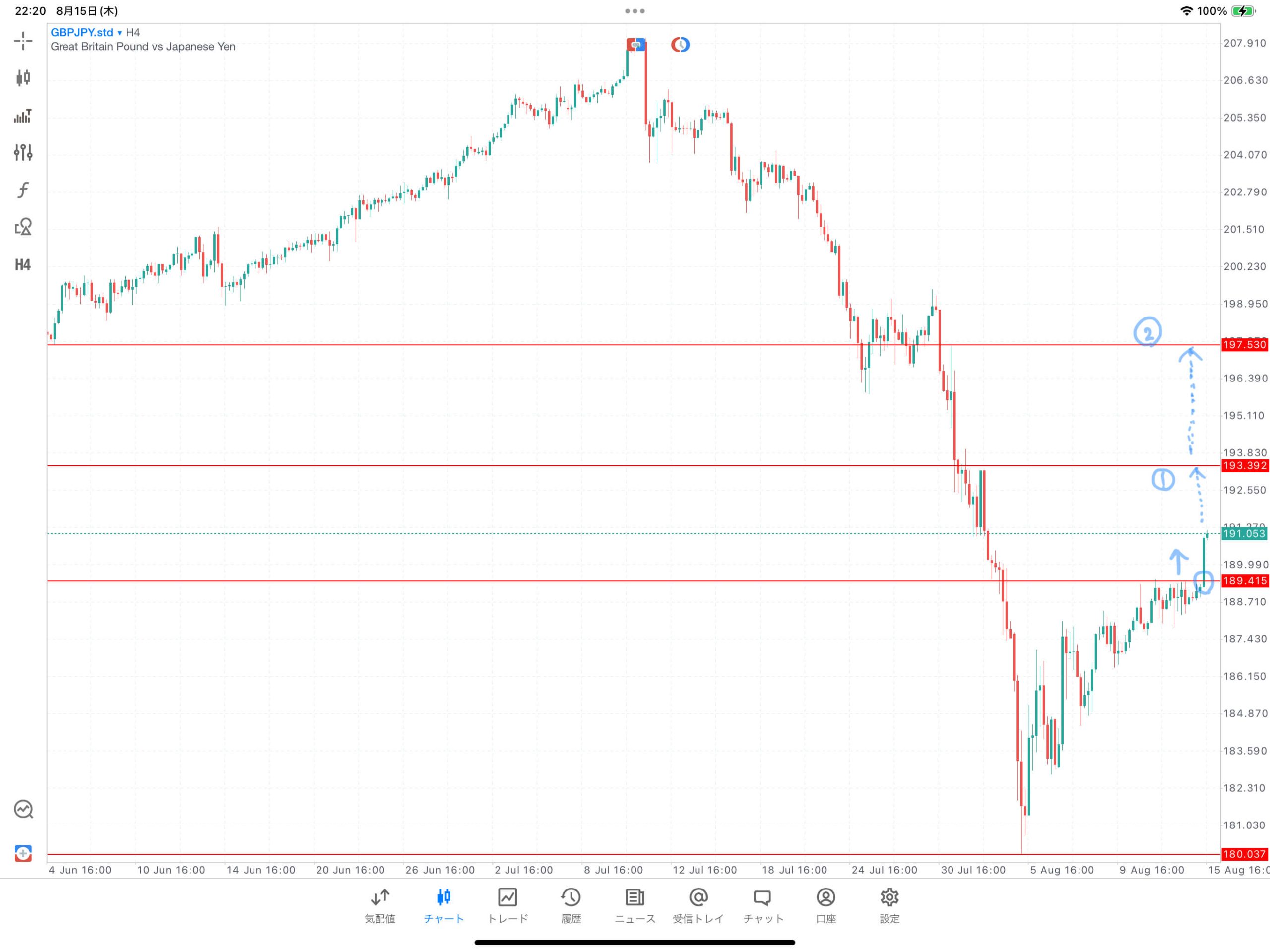 ただし、チャートとしては次に目指すのは①193.392あたり。そこらへんで少しゲジって、また勢いをつけて上昇してくれれば②197.530あたりまでは狙える。ポン円の値動きからすると、ショート勢の損切りと、週足でのチャートから買い場と見ていたロング勢が俄然買い増しして、一気に上がる可能性もある。