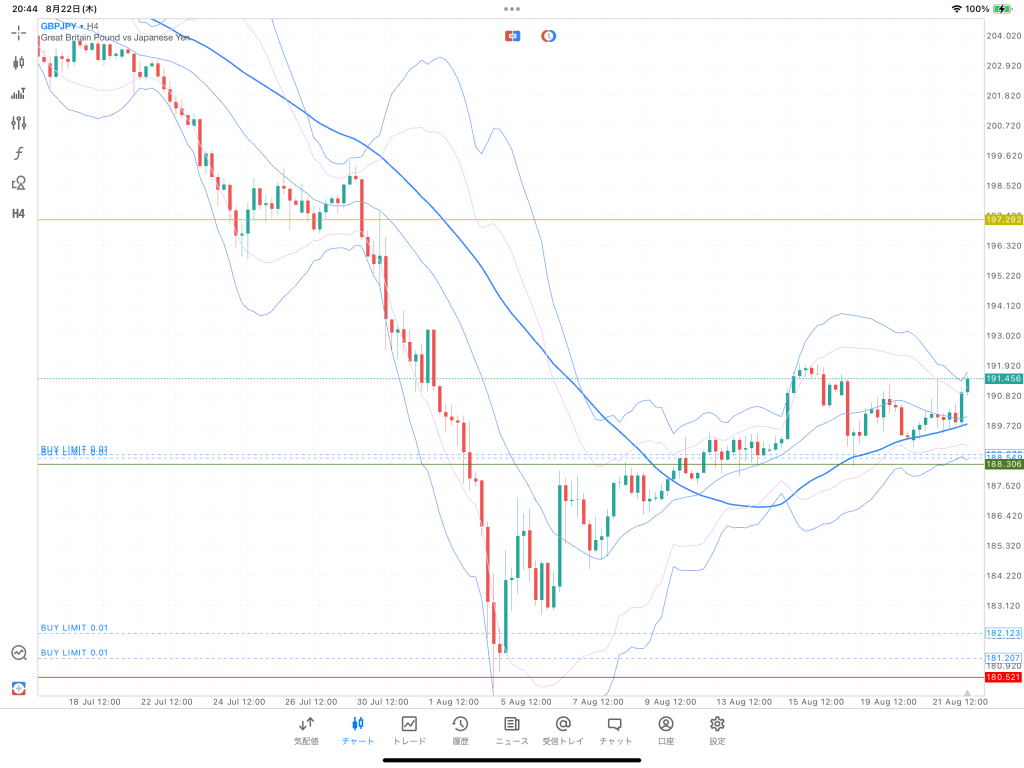 過去の検証で、自分の場合、飛びつきエントリーはまず失敗することがわかったので、しっかりと待つために予約注文限定で検証しています。もしも、1時間でしっかり伸びて、4時間でもボリバンがエクスパンションするようなら、197.000あたりまでは全然期待できる相場状況になります。だとしてもしっかりと押し目を作るのを待ってからエントリーしていきたいと思います。