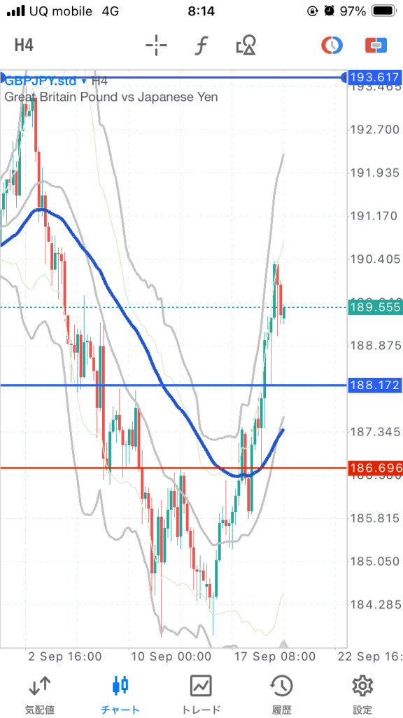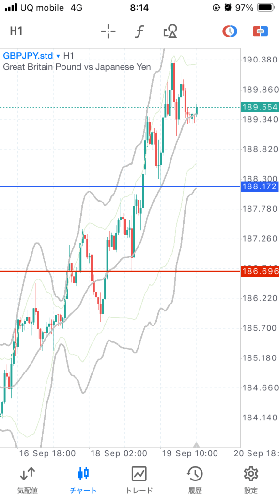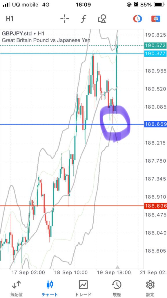 ちょっと待ちすぎて上がっちゃいました。一時間足ボリバンに接するあたりてわエントリーもありでしたね。このあとは押しを狙ってロング。