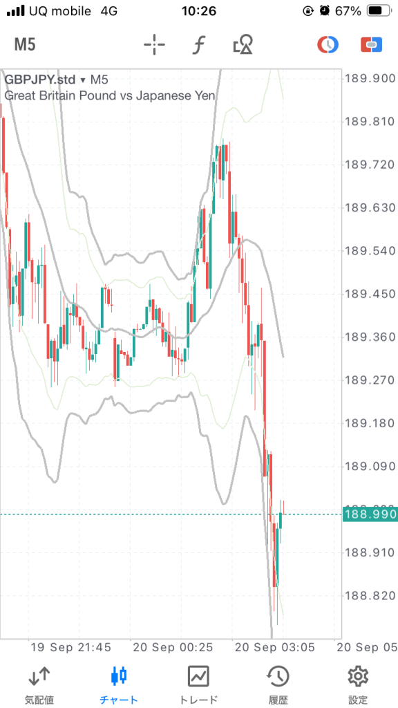 この5分の下落から上に転換するタイミングを狙いたいです。おそらく1時間のライン際になると思います。多少ラインから遠くても、この下落からの上転換は狙いたいです。