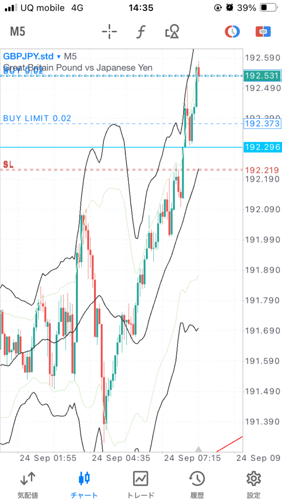 水色、1時間の高値ラインを抜け、さらに上に抜けそうな感じになってきてエントリー↓。このときはリスクリワード1:3くらい取れたのでロットもましまし。利確は1時間の次のライン。