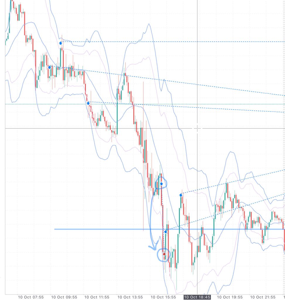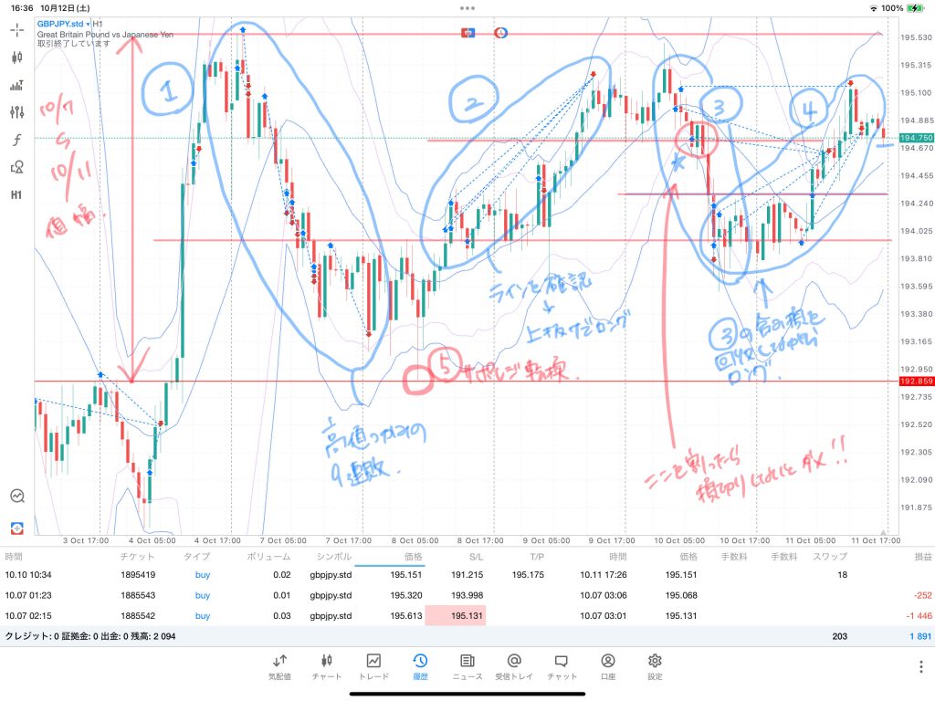 9日 レンジの上抜けをしたところでのロング。②の波を捉える。反転が始まったと確信し、数量も増やす。(もし逆いったら結構ピンチでした。)途中、買い増しして一時的な逆行で損切りしたので全勝とは行かなかったものの、5戦4勝1敗+10588円