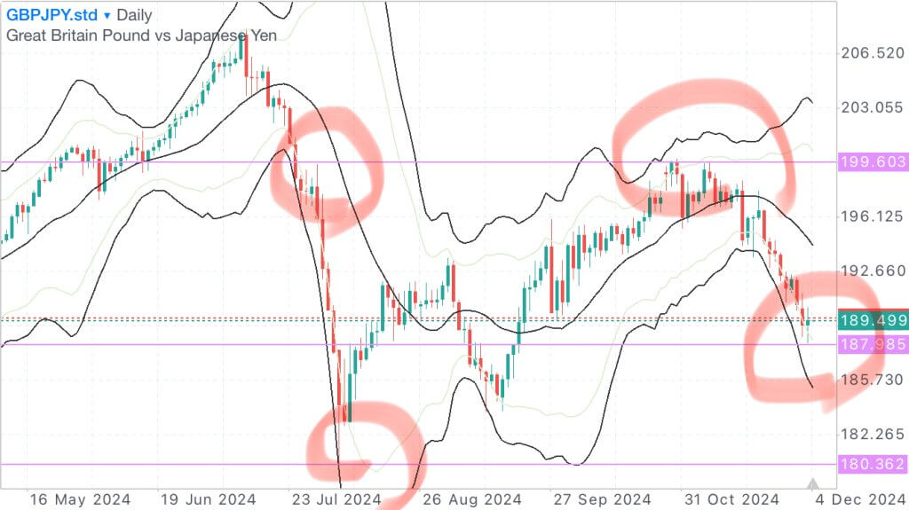 昨日は下落したものの大きく反発。結局、現在は陽線をつけている。今日上げるかどうかでいったんこの大きな下落トレンドが終了する可能性も出てくる。