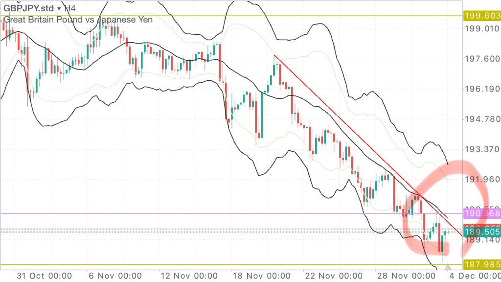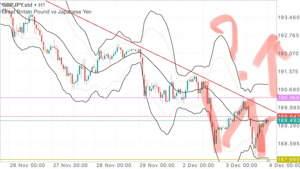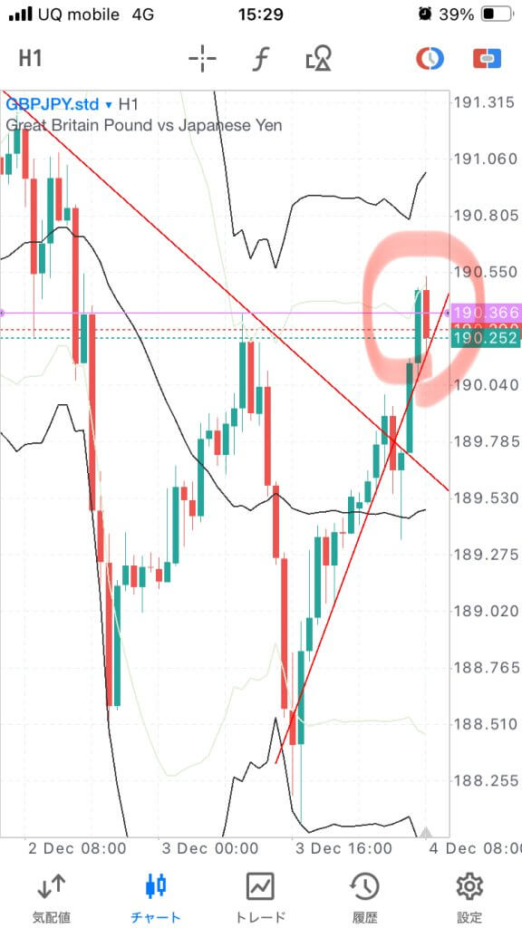 1時間の下落ダウの起点となっている高値抜け。一時間足確定もヒゲをほとんどつけないため、全ポジ損切り。➖100pip。でもその後下落、、、。ここで追いかけてショートとかするとハマっていくので一旦撤退します。