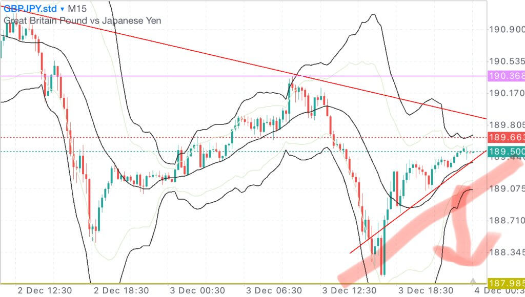 4時間足でも下落幅は小さくなってきている。ただしトレンドラインの下にいるのでまだショート目線。