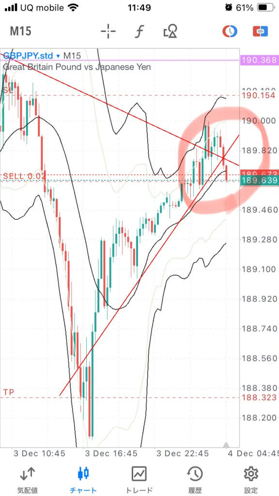 割ってきたのでショートで入りました。1時間下落トレンドラインに接する点と15分上昇トレンドラインが接する点になります。