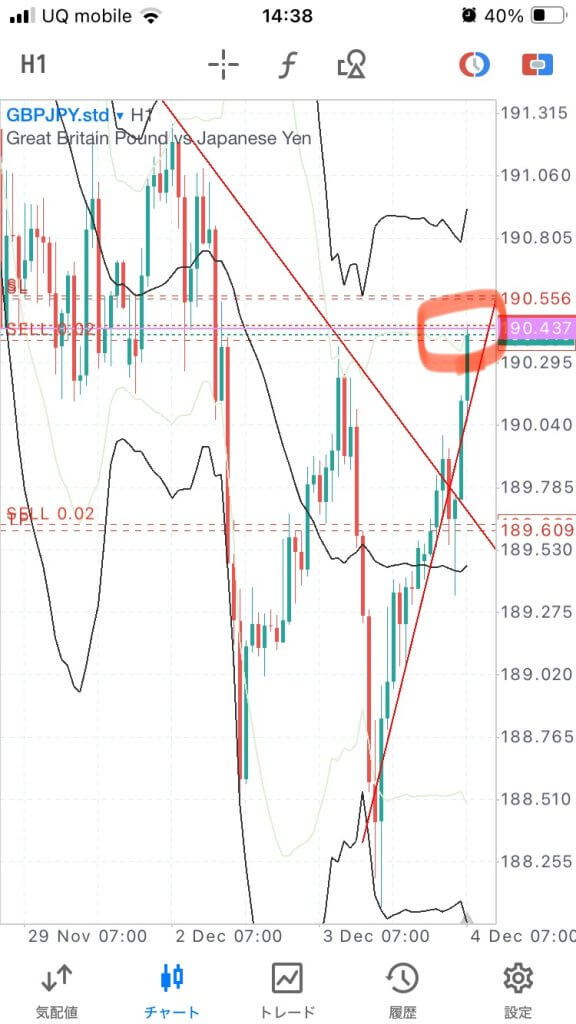 一旦は落ちたものの逆行。ルール通り1時間のダウのラインでナンピン。ここを抜かれたらやはり下落トレンド終了。全ポジ損切りでロング目線に切り替えです。