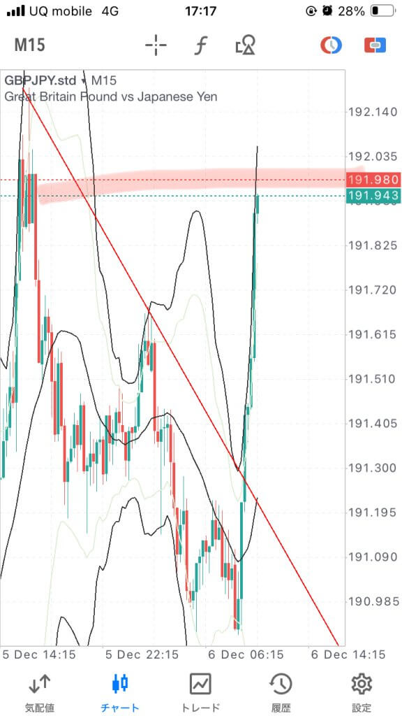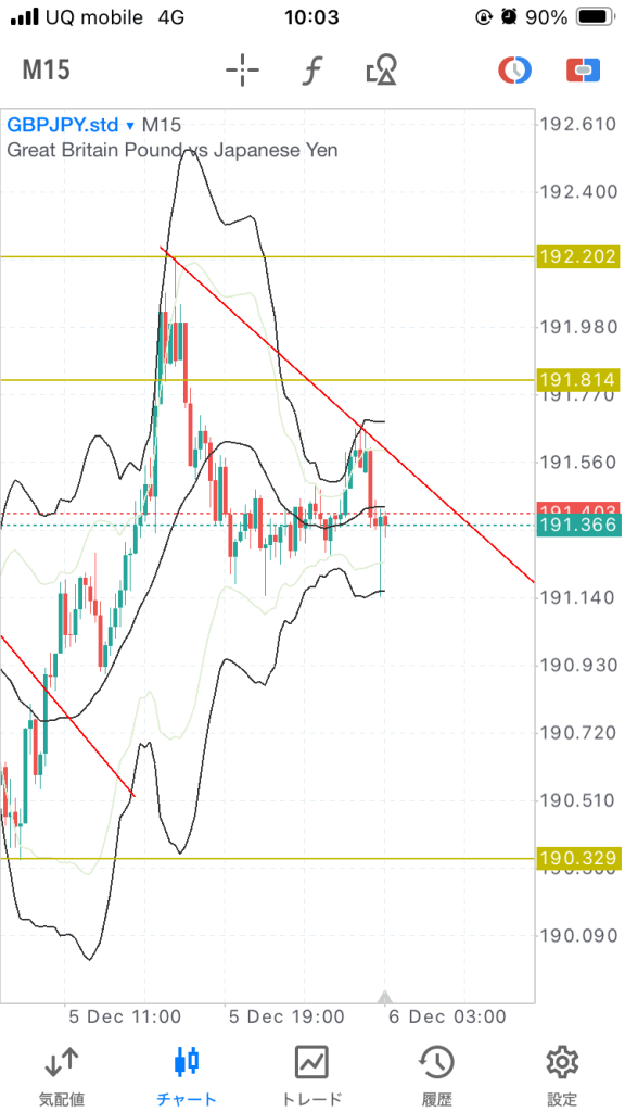昨夜利食いしたあたりから、かなり下げてました。トレンドラインを上にブレイクしたらロング予定。