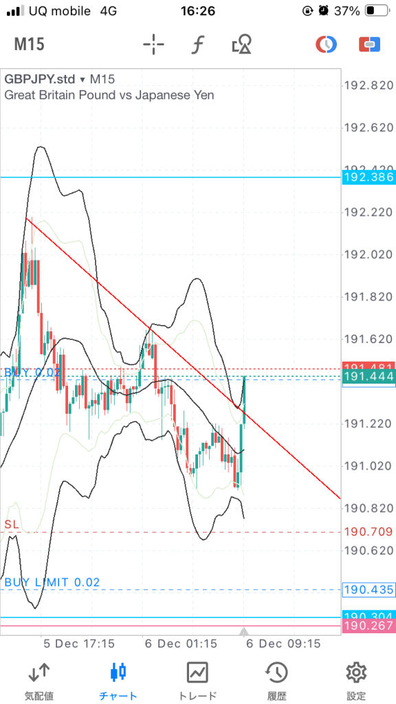 ほんとは15分確定まで待つところですが、5分足がはっきり飛び出して確定したのでロングエントリー。利確は昨夜の高値付近です。日足ではまだ下目線。昨夜のエリオット3波が思いの外伸びずに深く戻したので利確は無理せずいきたいと思います。