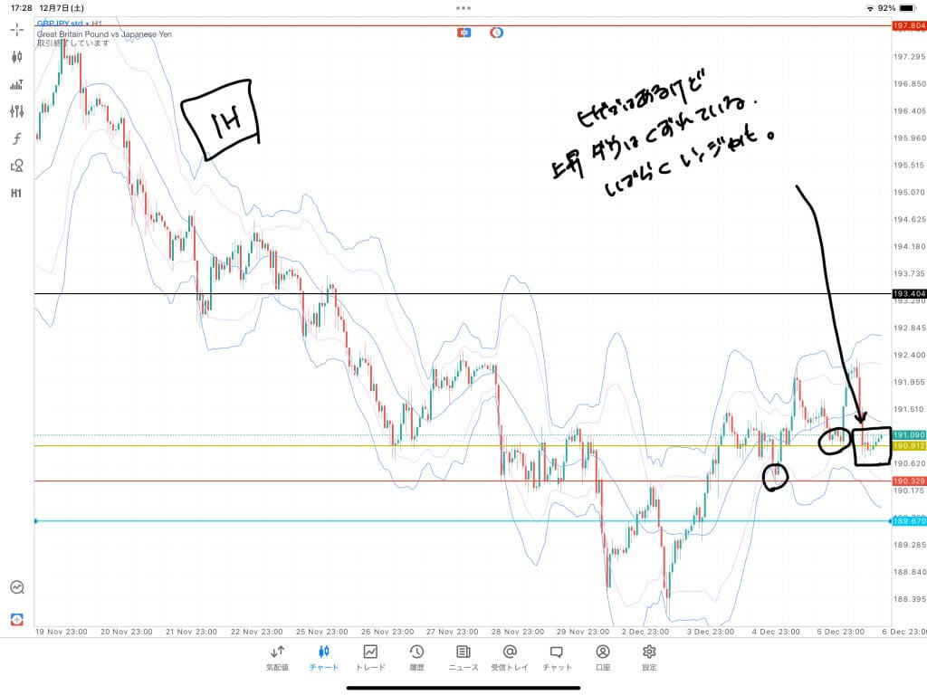 1時間に落とすとおゆるやかに高値更新しているものの不安定な相場になっています。目線としては上ですが、一旦ひと動きしてからエントリーについては判断して行った方が良さそう。