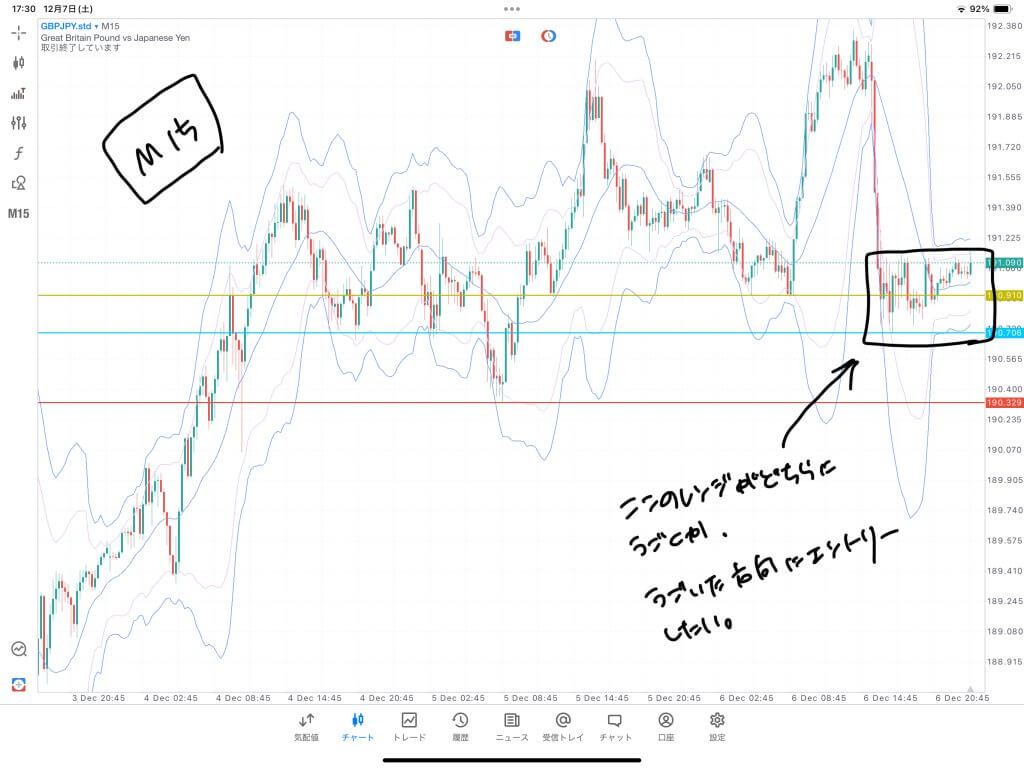 15分を見ると急落の後横ばい。上位足の環境認識的にやや不安定なため、レンジブレイクで安易に飛び乗ると危険な相場な気がします。