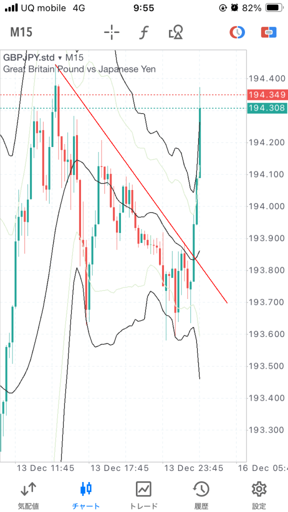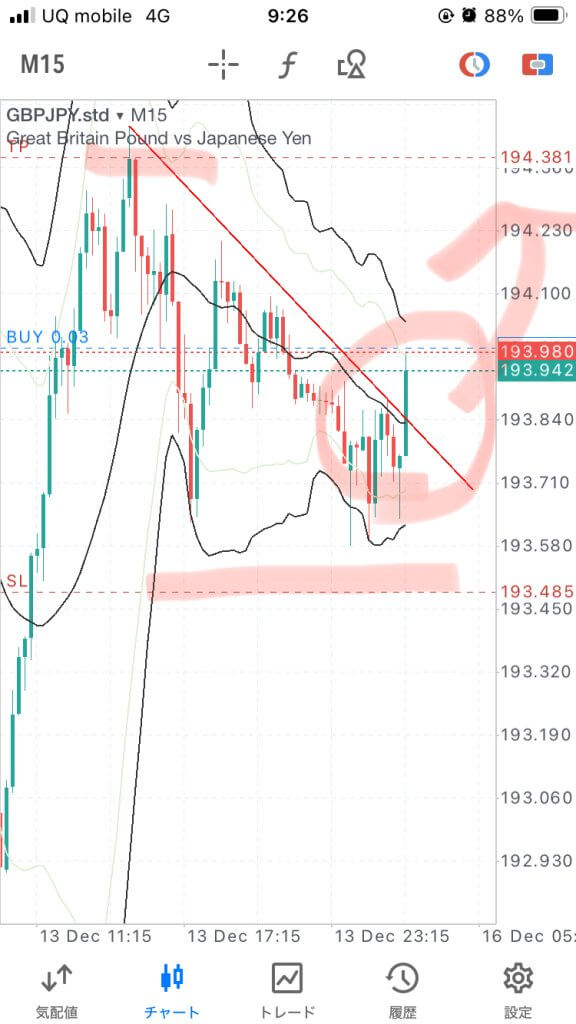 4時間の目線方向へ15分足トレンドラインブレイクでのロング。4時間レンジ内なので、直近高値を利確ライン。