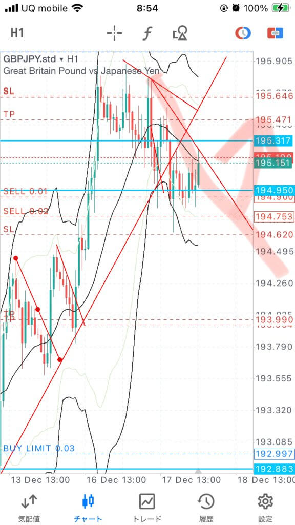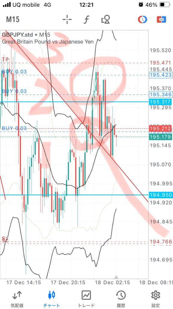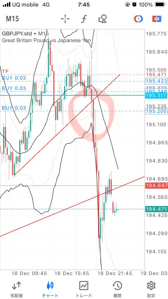 その後、1時間の下落トレンドライン抜け出で上昇。含み益が出てましたが急落。損切りしそびれて今に至ります。含み損、、。やばい展開ですが、4時間も1時間も上目線なのでこのまま保有。再度下落トレンドラインを上抜いたところでナンピン。何とか回収していきたいと思います。