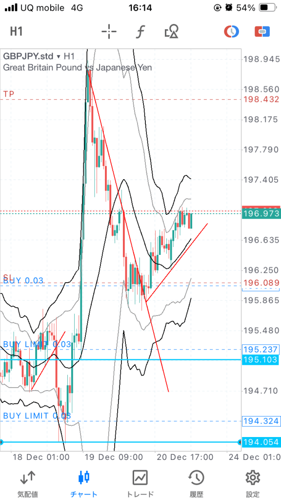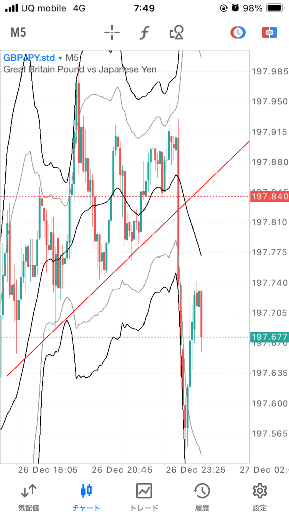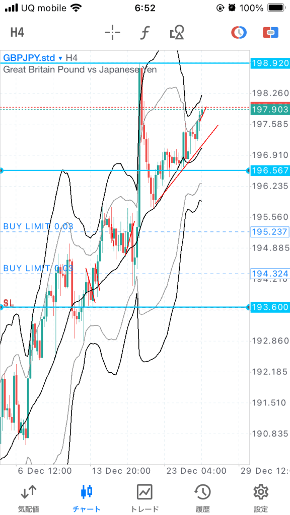27日まで保有。ジリジリ上がってこんな感じ。4時間ボリバンに当たりそうなので、年末ということもあり決済。➕180pip。