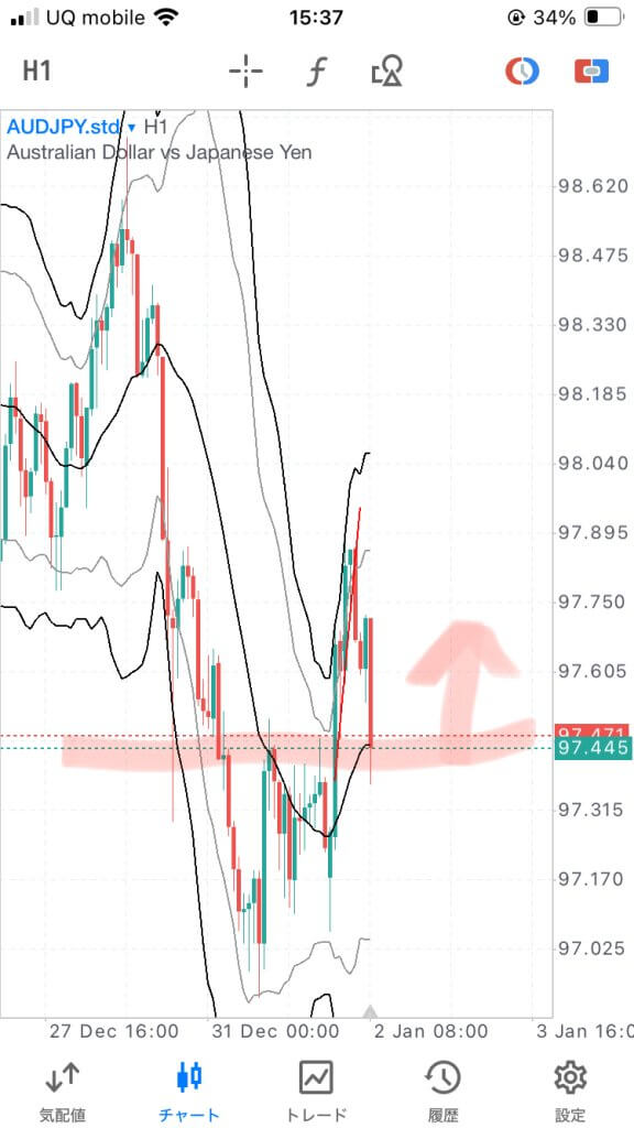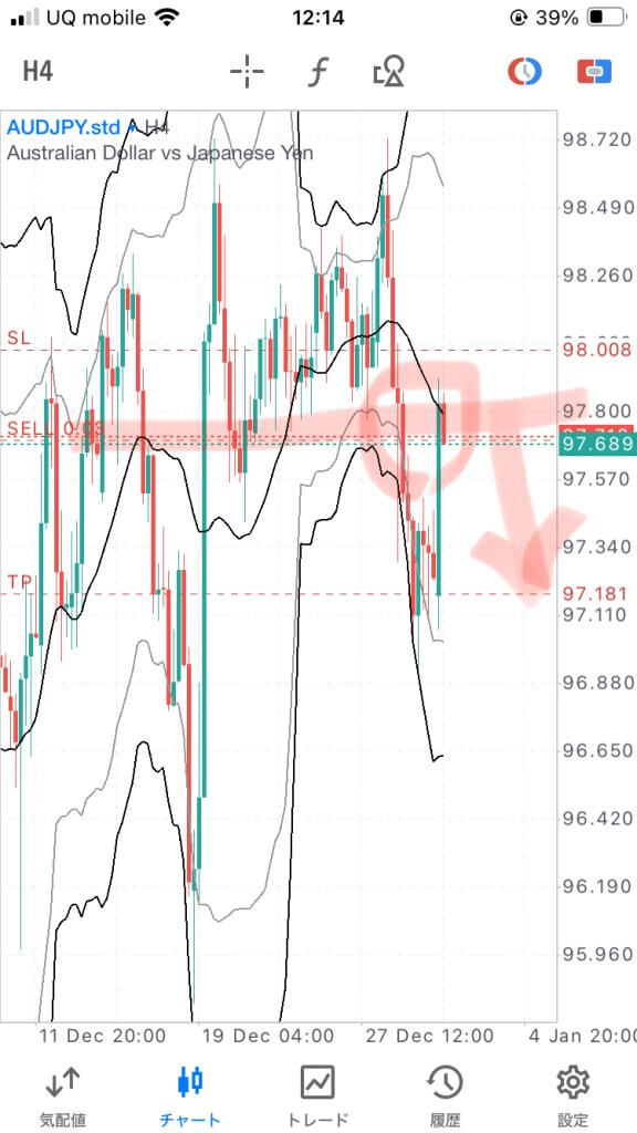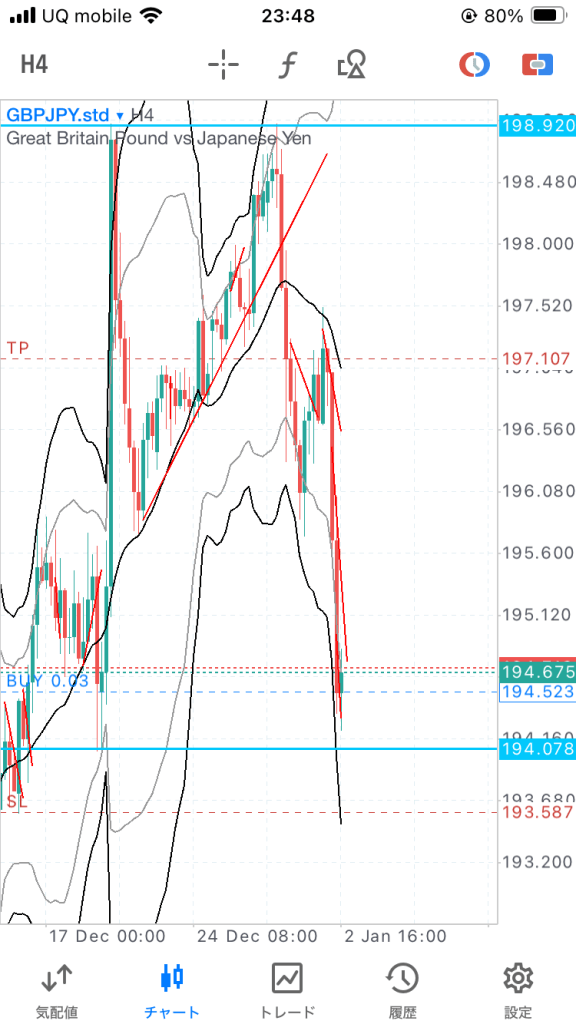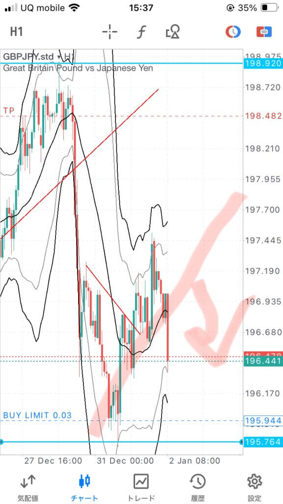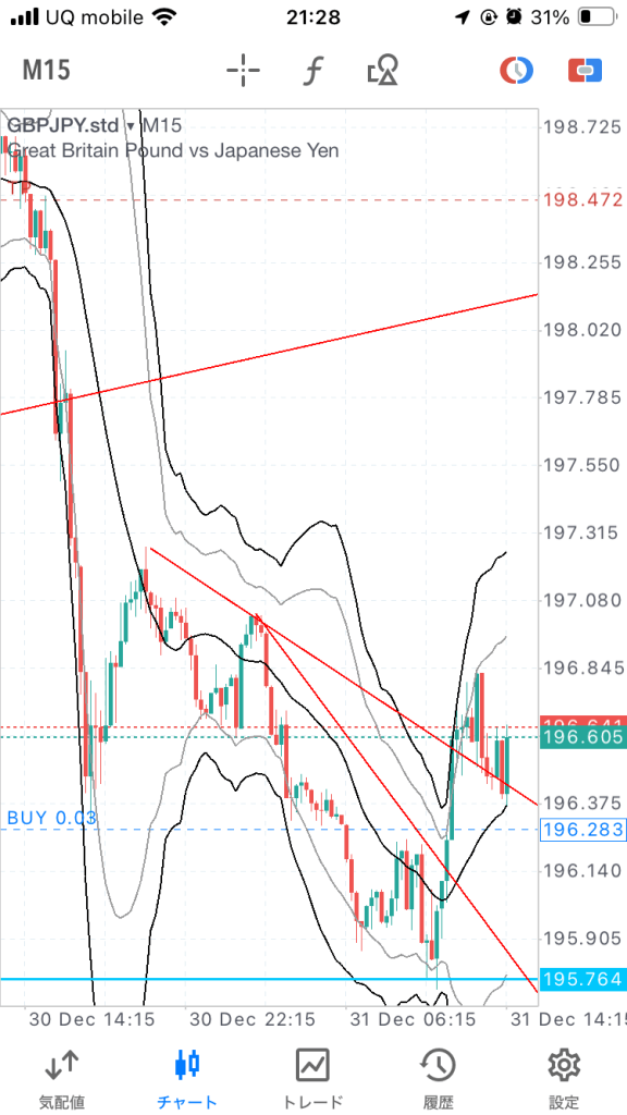 大晦日にエントリー。4時間上目線からの下落転換。15分トレンドライン割れ。