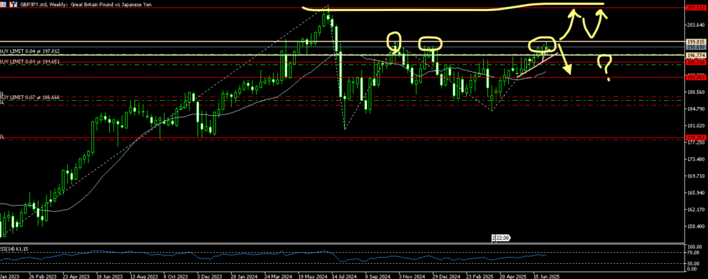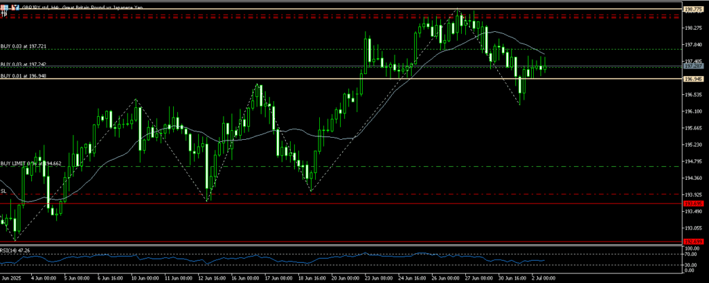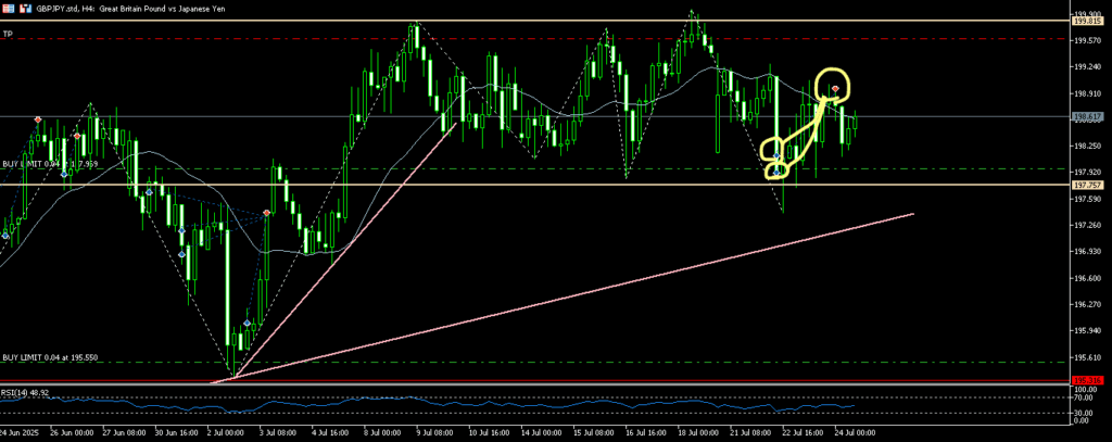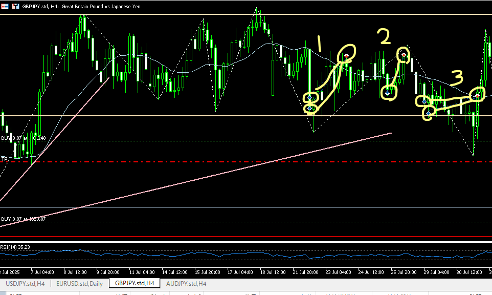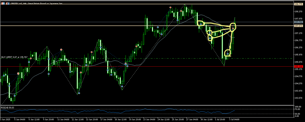 こんな4時間足ではじまった7月。日足ではまだロングフォローですが、4時間足では目線は下に。一段下げられちゃうとちょっと嫌な展開。微妙であることは間違いない。